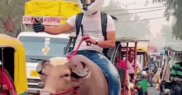 Trong video gây sốt trên Instagram, một người đàn ông đang cưỡi trâu trên đường phố Delhi, Ấn Độ. Người đàn ông cũng trang bị một chiếc mũ bảo hiểm đặc biệt phù hợp với "chiếc xe 4 bánh" này.